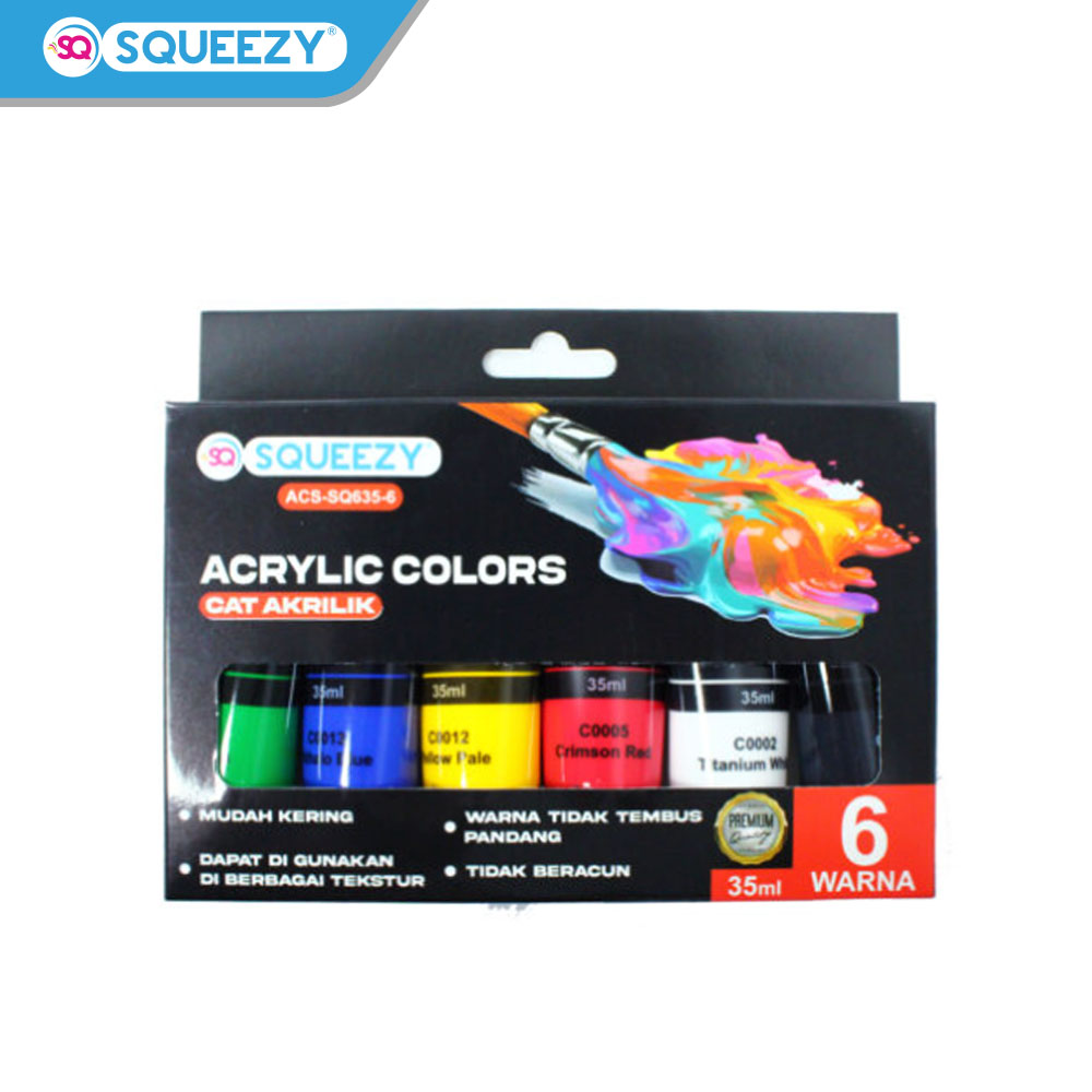 Keunggulan dari merk Squeezy ini adalah pigmen warnanya yang cenderung cerah dan tahan lama, serta daya tutup yang baik. Dengan ukuran 35ml, set ini cukup ringkas dan ekonomis, sangat cocok untuk pemula atau yang ingin bereksperimen dengan berbagai teknik melukis tanpa memerlukan jumlah cat yang besar.