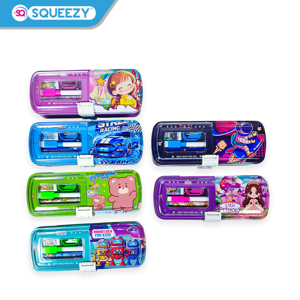 PC-SQ1008 adalah tempat pensil berbahan kaleng (metal) dari SQUEEZY yang sudah dilengkapi dengan isi perlengkapan alat tulis di dalamnya. Didesain dengan tampilan luar yang ceria dan motif menarik, produk ini sangat cocok untuk anak-anak usia sekolah dasar hingga menengah.