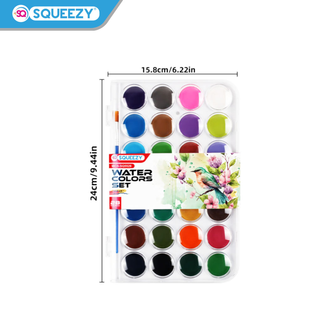 Produk โSqueezy Watercolourโ adalah set cat air yang tersedia dalam varian 12 Warna, 16 Warna, 28 Warna dan 36 Warna. Cat air ini memiliki tekstur lembut, warna cerah, mudah digunakan, tidak berantakan, dan tidak beracun, sehingga cocok untuk anak-anak maupun pemula.