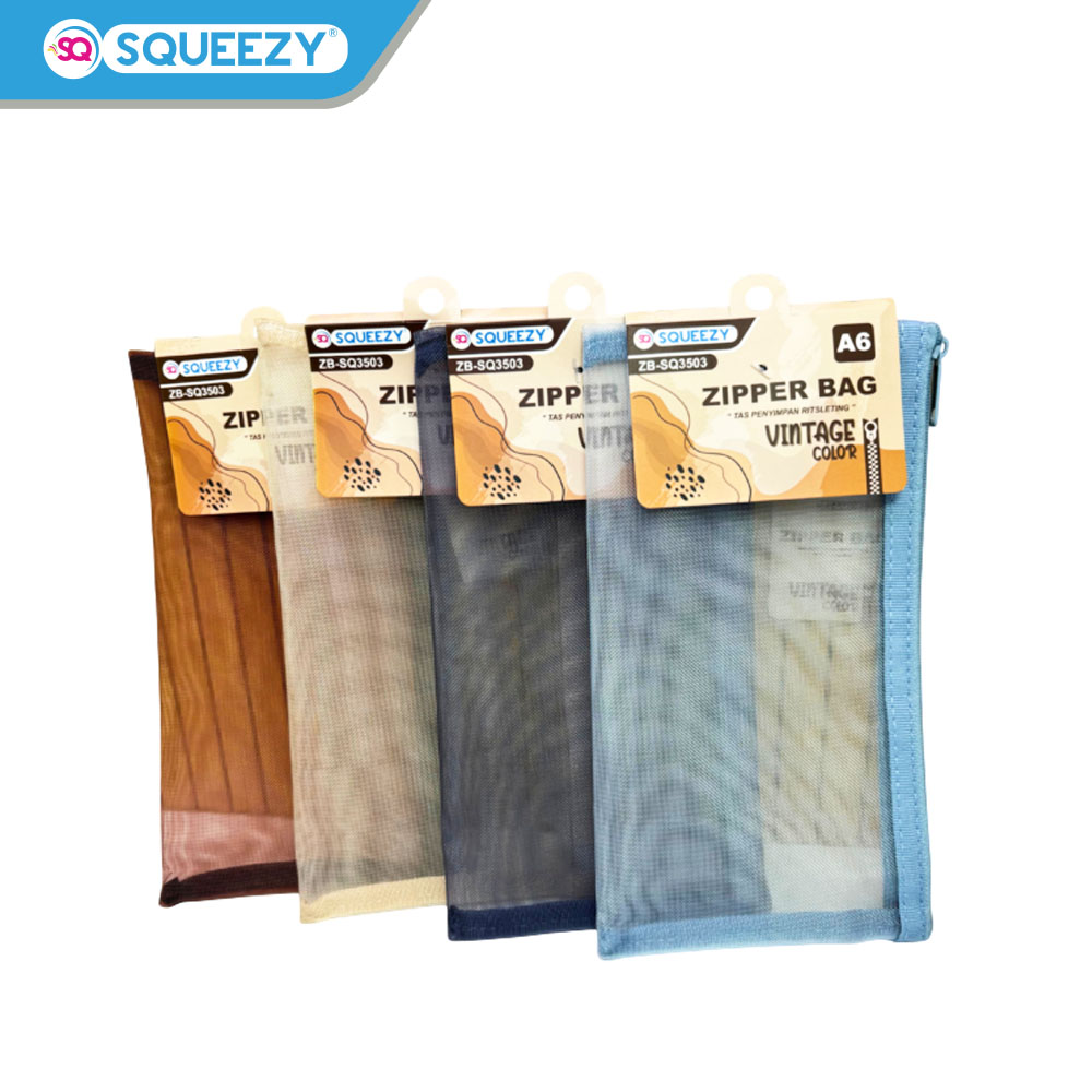 ZB-SQ3503 adalah zipper bag ukuran A6 dari merk SQUEEZY, hadir dengan desain vintage elegan dan bahan jaring nilon transparan yang ringan namun kuat. Ukurannya yang ringkas ±21 x 12 cm cocok digunakan untuk menyimpan uang, kartu, kertas kecil, flashdisk, kabel, atau alat tulis mini.
